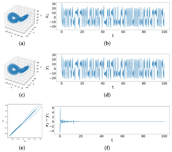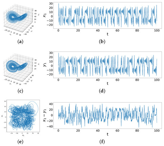 where . The initial conditions for the first Lorenz are ; the initial conditions for the second Lorenz are .