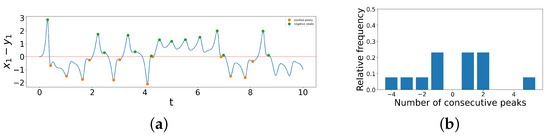 We now examine the difference time series of time interval of a coupled dissimilar Lorenz system when , shown in Figure 4a, and apply our method to create a peak series out of it. We first note that starts at 0 at , and the first zero-crossing occurs after one maximum, marked in green, above the central red line. Hence, our first element of the peak series is 1. Then, between the second and third zero-crossing, there are three minima, marked in orange, below , so our second element of the peak series is . Similarly, we can convert the number of consecutive peaks between each zero-crossing into a numerical element in the peak series. The peak series, then, of this difference time series from time interval is