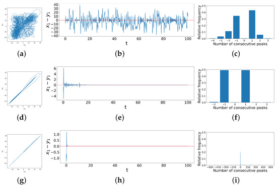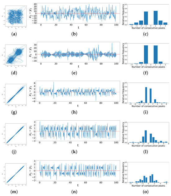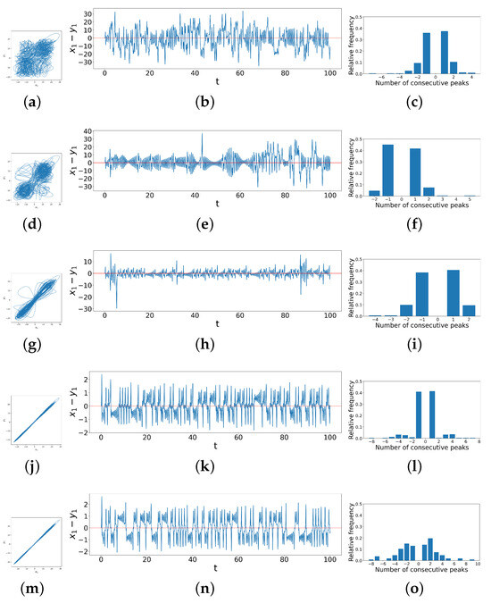 It is worth noting that our results show that the relationship between the level of synchronization and the value of is rather unconventional, namely, when the entropy increases, the level of synchronization increases as well. This is in fact due to the reason that practical synchronization (Figure 7n), the ultimate state for coupled dissimilar systems, has ringing patterns around 0, but complete synchronization (Figure 9h), the ultimate state for coupled identical systems, might not, resulting in a lack of zero-crossings and therefore huge values in peak series, leading to a larger value. Hence, is not a direct quantification of synchronization that draws a linear relationship between the two, but is instead a measure of the complexity of the differences in trajectories between two synchronized chaotic systems.