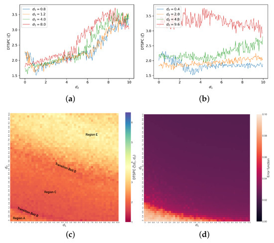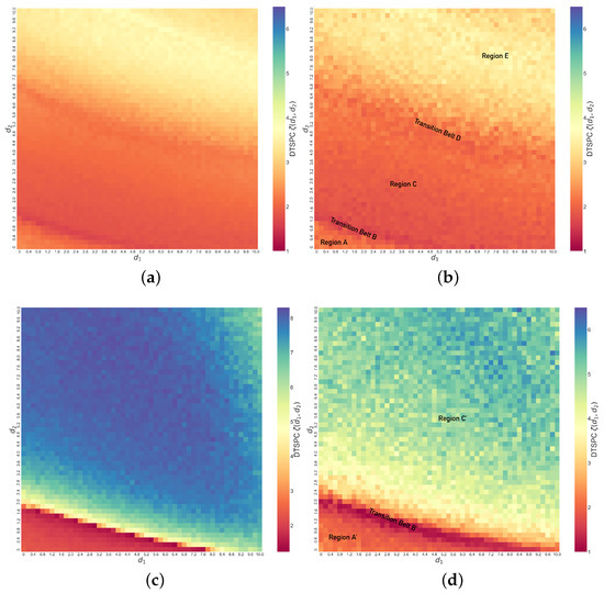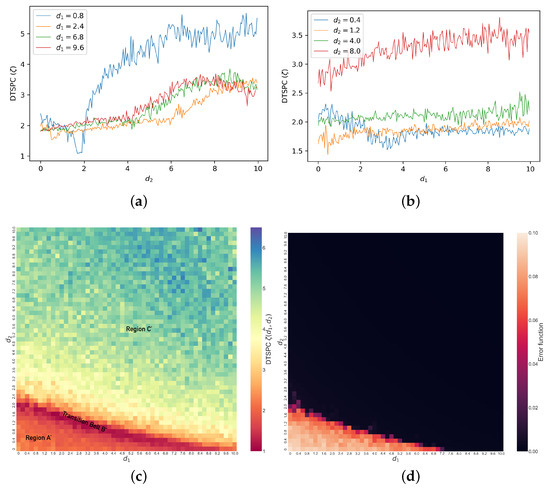 We now show how DSTPC () captures behavioral changes as increases for different constant values under the initial conditions . The line graph of versus when is plotted in Figure 6a. As we see in the graph, there is a significant drop in between and , a sudden increase between and , a steady increase between and , a sudden increase between and , and a steady increase after . Other colored lines in the figure also show as a function of under other conditions—, respectively. These four line graphs share similarities. The two respective periods of sudden and steady increases are present in all graphs. Moreover, when is larger, the initial sudden drop in at disappears, and there starts to emerge a final drop in at large values. The gradual changes in the plots with the increase in , as well as the changes in with the increase in (Figure 6b), motivate us to create a heat map of , i.e., displaying the DTSPC as a function of both coupling strength parameters.