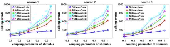 Numbers of neuronal spiking events by varying the coupling parameter of stimulus.