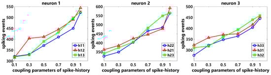 Then, under the condition that the stimulus frequency is 100 times/min and the coupling parameter of stimulus remains unchanged, the self-coupling parameters and the two cross-coupling parameters of spike history are gradually increased from 0.1 to 1, respectively. The results are shown in Figure 3. For neuron 1, when the self-coupling parameter or the cross-coupling parameters or of the spike history are gradually increased, the number of neuronal spikes also gradually increases with the rise of coupling parameters. This phenomenon is also observed in the spiking activity of neurons 2 and 3. In general, enhancing the self-coupling parameters or cross-coupling parameters of neuronal spike history can also evoke more neuronal spiking activity. In other words, the neuron’s own spike history as well as the other neurons’ spike history are also the main factors affecting the neuronal spiking activity.