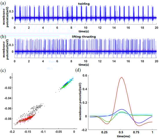 The classification case is shown in Figure 4. Figure 4a,b show the raw data evoked by two acupuncture manipulations, the twirling manipulation and lifting–thrusting manipulation. Figure 4c shows the wavelet characteristic parameters of all spiking waveforms under the two manipulations, which is a two-dimensional scatter plot. The wavelet feature parameters in the graph are distributed in four different color regions, so these spikes are divided into four categories accordingly, and the average spike in each category is shown in Figure 4d. Define the red high-amplitude spike evoked by neuron 1, the blue sinusoidal spike evoked by neuron 2, the green cosine spike evoked by neuron 3 and the cyan low-amplitude spike evoked by neuron 4. Because the amplitude of the spiking waveform of neuron 1 is higher, the distribution area of the wavelet characteristic parameters of neuron 1 is far away from the other three categories.