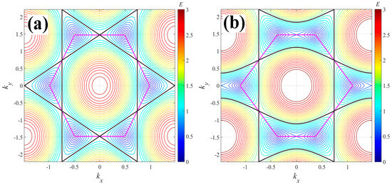 The energy spectrum of graphene represented as a contour map of the surface energy obtained by Equation (3): (a) pristine case : at , it exhibits a topological transition when the energy levels pass from the six Dirac cones (lower energy levels) to only one central figure resembling a dome at upper energy levels (see black line). Additionally, a magenta line connects the Dirac cones of the cell; and (b) doped case (): the topological transition occurs at (marked by the black line), and the Dirac cones shift in due to the compositional variation (observe changes in the magenta line compared to panel a). If , the cones merge.