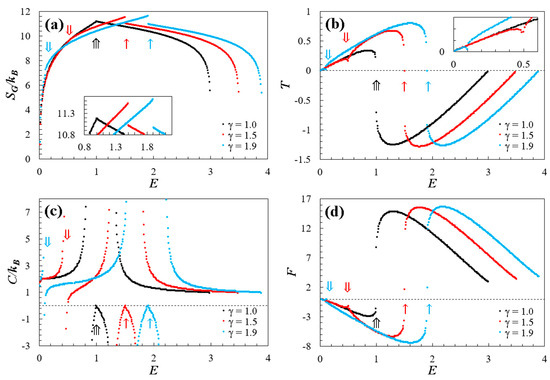 Thermodynamic properties (expressed by Equations (4)–(7)) are plotted against dimensionless energy . In all panels, the doped cases (red dots) and (blue dots) are contrasted with the thermodynamics behavior of a pristine graphene (black dots) [20,21]. The single (), double (), and triple () arrows highlight identical points of interest for energy and its progression in each property. The panels represent (a) entropy, (b) temperature, (c) specific heat, and (d) Helmholtz free energy.