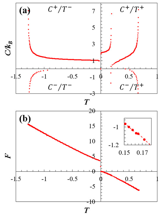 Figure 3b depicts temperature as a function of dimensionless energy , obtained numerically from Equation (5). In the presence of a restricted energy spectrum, both positive and negative temperatures are evident [27,28,29,30], as illustrated in this figure. Additionally, the temperature is bounded, exhibiting global maxima and minima for all studied cases. These critical points coincide with the inflection points of the entropy curve. For doped graphene (), two critical points emerge in the low-energy regime, dividing the curve around the point (refer to the inner panel in Figure 2b), due to the topological change that occurs in the low-energy spectrum as a result of the dopant. The energy point that divides the temperature curve is related to the effect of the dopant by the linear equation for (with ). Moreover, it is crucial to emphasize that these points not only mark the topological transitions but also indicate the boundaries between positive and negative temperatures of the system. In this regime, the doped case reaches a higher temperature range compared to the pristine counterpart, directly attributed to the applied compositional variation (), and can be fitted with the quadratic relation , for with . Moreover, for energies below at the point , temperature values demonstrate a linear behavior conforming to , consistent with the equipartition principle and the Dirac equation [20,21].