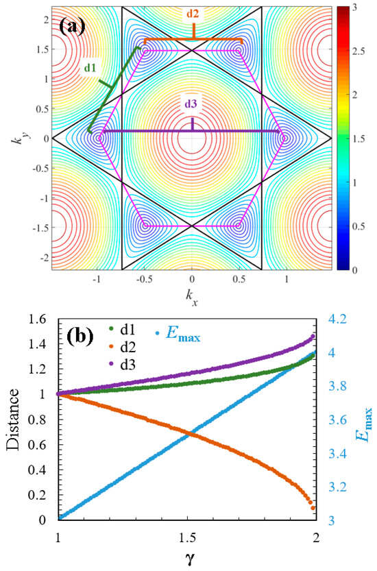 Topological changes caused by the heavy dopant atoms: (a) distances , , and between the centers of the Dirac cones; and (b) a double-axis plot representing the effect of dopant on the distances , , and and the maximum energy of the graphene.