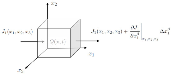Illustration of flux and charge accumulation within a representative volume element (RVE) using fractal operators. The volume element has size . The current density in the direction () over is shown along with as the total charge in the RVE.