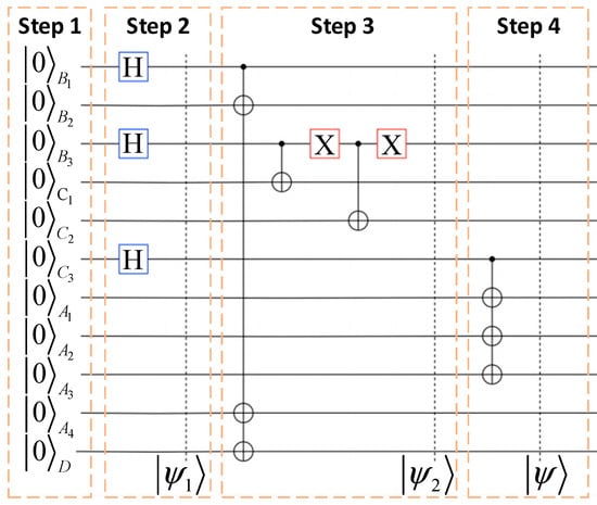 Step 3. This step implements CNOT gate operations on qubits (B1, B2), (B1, A4), (B1, D), and (B3, C1) and (B3, C2), respectively, subsequently applying the Pauli-X gate operation twice on qubit B3. Then, the state will convert into |Ψ2⟩, that is shown as follows: