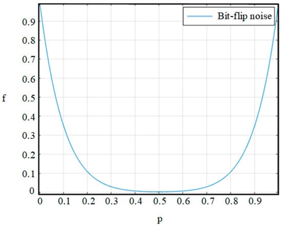 Based on the fidelity formula described above, we conclude that the fidelity of the protocol in the bit-flip noise channel is only dependent on the noise intensity. Additionally, by running the expression via MATLAB, as depicted in Figure 3, it can be visually observed that as the level of bit-flip noise increases, the fidelity exhibits a parabolic trend, initially decreasing and then increasing.