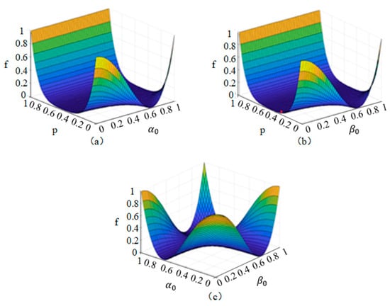 In Figure 4a, take β0 = 0, β1 = 1, and α0 = a; fidelity is only associated with the noise intensity p and amplitude parameter a of the initial state. When the noise intensity p is in the interval [0, 0.4], the fidelity decreases rapidly as the noise intensity increases, while the change in parameter a has almost no effect on the fidelity. The fidelity reaches the worst case when the noise intensity is around 0.6. When the noise intensity is in the interval [0.6, 1], the fidelity of the protocol decreases with parameter an up to a = 0.5, then the fidelity increases as an increase, reaching almost 1, indicating excellent communication transmission.