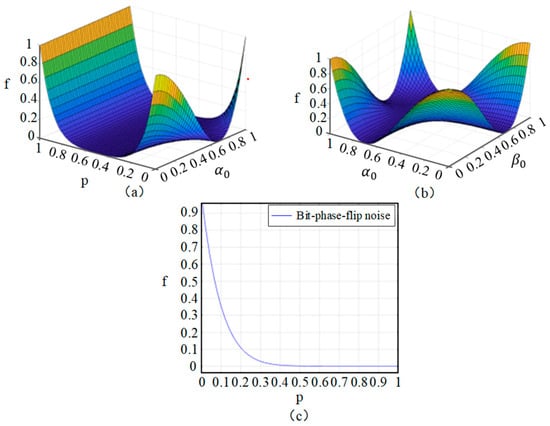 In Figure 4c, take the phase-flip noise intensity p = 1, α0, β0. At this time, the fidelity is related to parameters a and b. As can be seen from the figure, the image of fidelity change is a “concave” shape. As a and b increase, the fidelity will decrease first and then increase. The fidelity reaches a minimum when a and b are all around 0.6. It is worth noting that when one side of the parameters a and b tends to 1, and the other side tends to 0, a similar high fidelity can be achieved and complete quantum communication.