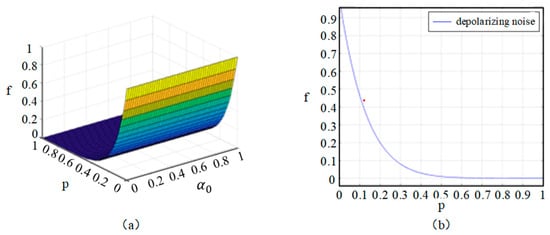 In Figure 6a, take β0 = 0, β1 = 1, and α0 = a. At this point, the fidelity is related to the channel noise intensity p and a. The fidelity decreases significantly with the noise intensity in the channel. It is worth noting that the parameter a has very little effect on the change in fidelity.