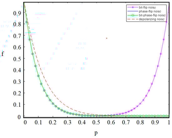 In Figure 5c, when α0 = β0 = α1 = β1 and substituted into Equation (36), the fidelity of the protocol is only related to the intensity of the bit-phase-flip noise. When the channel noise intensity is in the interval [0, 0.2], the fidelity decreases sharply with the increase in the channel noise intensity. When the channel noise intensity is in the interval [0.4, 1], the fidelity tends to 0. Obviously, it can be found that the bit-phase-flip noise has a more drastic impact on its quantum fidelity than other types of noise.
