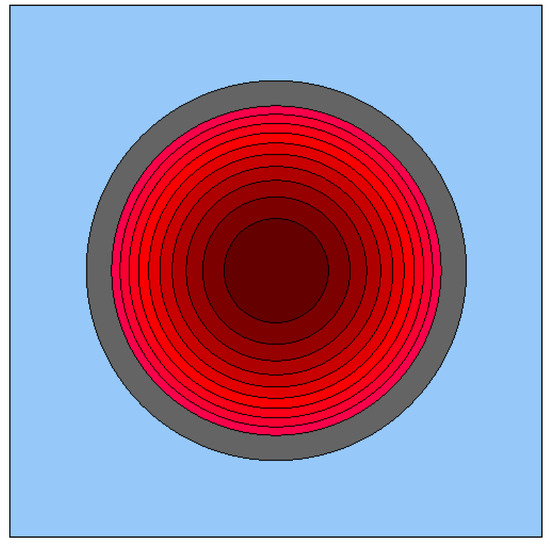 The scheme of the fuel pin’s horizontal cross-section geometry. The red region is the fuel pellet divided into concentric rings of equal cross-sectional areas, and the gray region is the cladding.