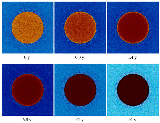 where is the neutron flux at position and energy E, and is the macroscopic cross-section, related to the probability of fission. The fission rate density of a fresh fuel pin begins with a relatively uniform distribution, but after just a few days (>0.1 MWd/kg), the fuel starts to burn more intensively at the edges of the pellet (more fission at the edge). This effect is associated with the accumulation of poisons inside the pin, and the easier access of thermalized neutrons to the edges of the pin. Then, as seen in Figure 2, the fission rate quickly increases at the edge of the pin and decreases in the center. However, after around 1.5 years (>20 MWd/kgU), fissile material starts to become deficient at the edge of the pin, and the situation begins to reverse. The fission rate at the edge starts to decrease in favor of an increase in the central part of the pin, and the distribution begins to take on a completely opposite shape (see the visualization of thermal neutron flux and sources for selected burnups presented in Figure 3).