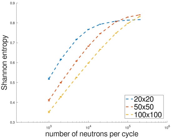 Convergence of Shannon entropy for different numbers of neutrons per cycle. Simulations of 100 cycles were calculated for fuel initial state using three different grids: 20 × 20, 50 × 50, and 100 × 100.