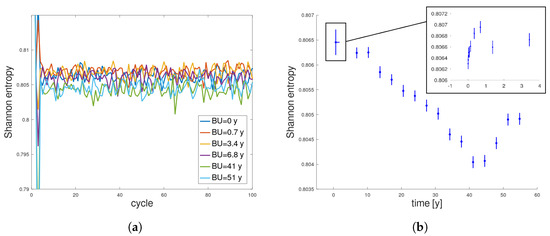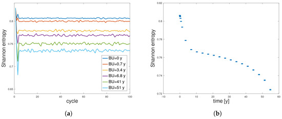 In this section, an analysis of the convergence of the Shannon entropy was performed for each determined state during burnup (for each burnup step), for 100 cycles (+10 inactive cycles), and neutrons each. Figure 5a shows the convergence of the Shannon entropy during the simulated cycles at selected burnups. The graph indicates that entropy stabilizes within just a few initial cycles and oscillates around a certain average value. Additionally, from Figure 5a,b it can be seen that the greater the burnup, the lower the final average value of the Shannon entropy. This could suggest that the system is organizing itself, and from a more homogeneous source of neutrons, a more refined structure begins to form, resulting in a decrease in the Shannon entropy, which is partly confirmed in Figure 3. However, analyzing Figure 2, we can observe another effect—along with the burnup, effectively each of the simulated neutron histories leads to fission less frequently (the effective neutron multiplication factor from Equation (1) falls below 1), which results in a smaller number of available sources and a decrease in fission rate density. The smaller number of sources leads to reduced statistics, and this (according to Figure 4) may lead to an artificial decrease in the value of the entropy.