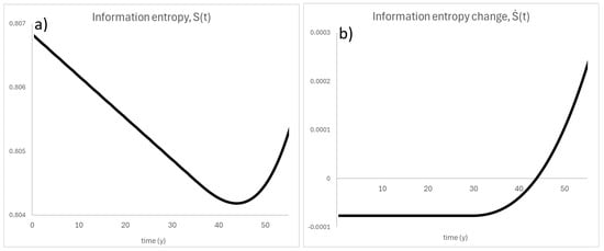 (a) The approximated function of information entropy related to time; see Figure 6b. Please note that the function S(t) created the “U-shape”, similarly to every far-from-equilibrium complex system. (b) The first derivative of information entropy, namely, the entropy change over time, which changes the sign at around 45 years of operation.
