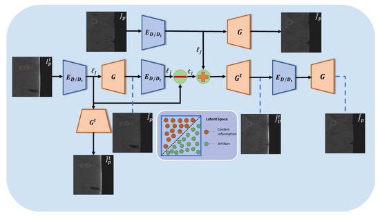 The first term in the equation enforces that there is no feature loss when artifact-affected images pass through the encoder–decoder pathway, while the second term ensures that there is no content feature loss when artifact-free images pass through the pathway. In this way, we can consider that when the artifact-affected image passes through the pathway, the content features are extracted. And, because when it passes through the pathway all features including content and artifact features are extracted, we can approximately assume that the difference between the two pathways is the entirety of the artifact features.