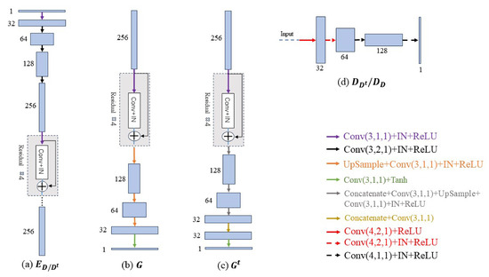 The detailed network architectures of the primary parts in PIDNET; (a) shows the details of the encoder , (b) is the generator G, (c) represents the generator , and (d) denotes the discriminator, . IN refers to Instance Normalization, while ReLU represents LeakyReLU, except for . Additionally, k, s, p in Conv() signify the kernel size, stride, and padding size, respectively.