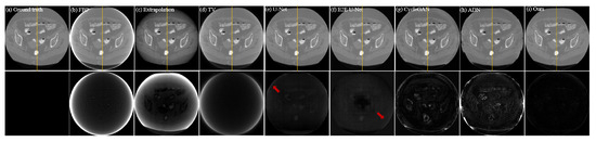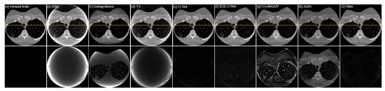 Qualitative comparison of different methods on preclinical dataset; (a–i) represent the ground truth and the resulting images from FBP, Extrapolation, TV, U-Net, E2E U-Net, Cycle-GAN, ADN, and our PIDNET, respectively. The second row shows the residual images derived from comparing the resulting images with ground truth. The yellow lines indicate the positions of the profile plots shown in Figure 9.