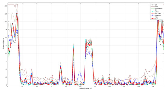 Comparison of the profile plots of the yellow lines indicated in the resulting images shown in Figure 8.