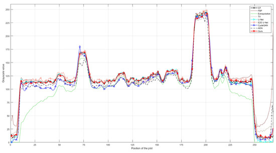 Comparison of the profile plots of the yellow lines marked in the resulting images shown in Figure 4.