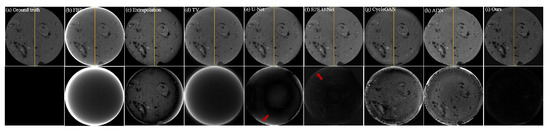 Table 4 shows a significant increase in SSIM and PSNR scores from Var1 to Var6. Var1, having only discriminative constraints, fails to recover many image details. However, when introducing the reconstruction loss in Var2, the network’s performance notably improves. At this stage, the network’s performance surpasses that of the classical unsupervised Cycle-GAN model. Subsequently, with the inclusion of artifact consistency and cycle consistency losses, the network’s performance sees a marked enhancement over Var2. SSIM increases by nearly 5 percentage points, and PSNR improves by approximately 4.6 dB. To further optimize the network, the polar coordinate transformation is incorporated in Var4, forming Var5. The performance metrics of Var5 show further improvement, indicating that polar coordinates indeed help enhance the separation of artifact features and content features. Finally, with the addition of lateral TV constraints in Var6, compared to Var4, SSIM increases by 1.6 percentage points, and PSNR improves by nearly 4 dB. These results demonstrate the effectiveness of polar coordinates and the lateral TV constraint. Consistent with Table 4, the residual images from Var1 to Var6 in Figure 10 are getting smaller, confirming that all introduced constraints and tricks significantly contribute to improving network performance.