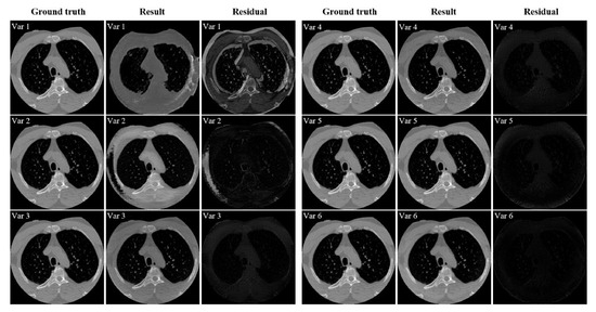 Qualitative analysis of the ablation study of the proposed PIDNET conducted on dataset CL1. Var1–Var6 mean different components added to the network. Each group’s three columns represent ground truth, resulting image, and residual image, respectively.