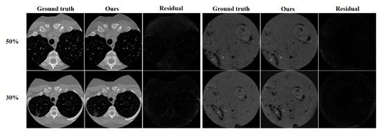 From Figure 11, it can be observed that the resulting images and residual images under both truncation ratios and image sizes do not exhibit significant differences. Table 5 shows the SSIM and PSNR scores for the two experiments.The evaluation metrics at different truncation ratios do not differ much as the truncation ratio increases and the image size changes, which demonstrates that our method has good robustness and adaptability.