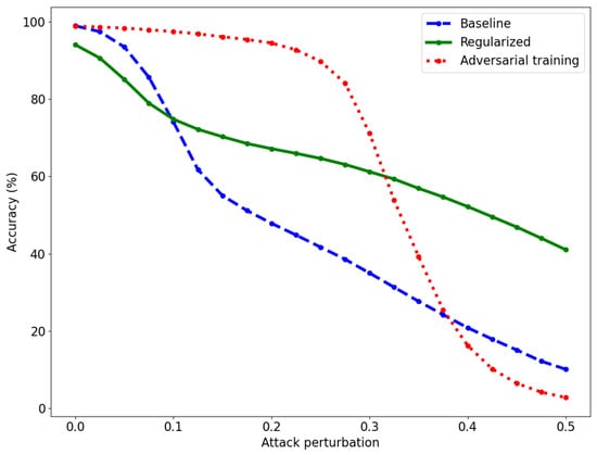 Accuracy of the baseline (dashed, blue), regularized (solid, green), and adversarially trained (dotted, red) models for various attack perturbations on the MNIST dataset. The perturbations are obtained with PGD using norm.
