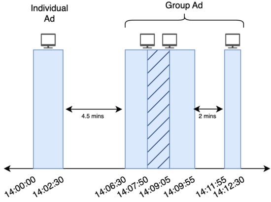 This grouping is facilitated by defining an advertising impact duration parameter, denoted as t. For each advertisement, we analyze the time interval beginning at the advertisement’s start and the extending t minutes beyond its conclusion. When we examine these time intervals, if intersecting TV ad groups are formed, these ads are classified as a Group Ad. Figure 1 provides an illustrative example where t is set at 4 min and four consecutive ads are broadcast. The first ad, with no subsequent ad broadcast within 4 min of its conclusion, is categorized as an Individual Ad. The following three ads, however, share overlapping 4 m impact durations and are thus grouped as a Group Ad.