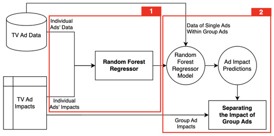 Group Ads are evaluated as a single advertisement during impact calculation. However, in our problem, it is crucial to measure the impact of each TV ad individually. To achieve this, it is necessary to separate the Group Ad impacts into individual impacts. As a solution to this, we employ an artificial learning (AI)-based approach. We represent the schema of our approach in Figure 5. In the first step, a dataset of characteristics and impacts of each Individual Ad is used as the learning set. Here, the impacts are used as the target variable, while the characteristics are the inputs of the AI model. Table 3 shows an example of these characteristics. A Random Forest Regressor (RFR) [25] is trained to learn the impact of each Individual Ad at this step.