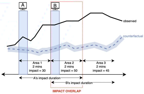 In the second step, the impact of each single Ad, which is a part of a Group Ad, is predicted by the model built in the first step. These predicted impact values are used as coefficients to separate the impact where the impacts of single ads overlap. For example, let us consider a Group Ad consisting of two single ads as illustrated in Figure 6, and the advertising impact duration t is set to 4 min. We consider an impact as the number of unique sessions resulting from a TV ad. Since in Area 1 and Area 3, there is no overlapped impact in the Group Ad, calculated impacts in these areas are assigned to single ads in the corresponding areas. In other words, 30 sessions in Area 1 is solely from single ad A, and the 45 sessions in Area 3 is from single ad B. On the other hand, in Area 2, there is an impact overlap. Using the RFR trained in the previous step, the impact of these single ads is predicted and used to separate the impact in proportion to these values. Assuming that their impact predictions are 40 and 60, the actual impact of single ads A and B become 20 and 30, respectively. As a result, the total impact of Group Ad, which is 125, is distributed as 50 from single ad A and 75 from ad B.