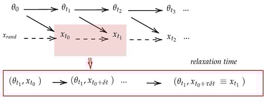 We denote the lag time parameters as . Here, the model subsystem evolves on the timescale , while the parameter subsystem evolves on the timescale . In the thermodynamic context, this parameter represents the relaxation time of the subsystem X under the fixed microscopic state of the subsystem . Conceptually, parameter acts as a complexity metric, quantifying the computational resources required for each parameter optimization step. Moreover, the dynamics of the joint exhibit a bipartite property. This implies that simultaneous transitions in the states of X and are not allowed, given that the observation of a new set of model-generated samples occurs only after a parameter update.