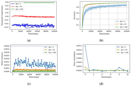 This experiment contrasts the parameter dynamics with three different mini-batch sizes: , and . The model under consideration is a four-layer feedforward neural network with a uniform width of 200 neurons. It was trained on the MNIST classification task using a vanilla SGD optimizer. The experiment was replicated over 50 trials to generate an ensemble of parameters. (a) One random parameter from the model’s last layer was chosen for each batch size scenario, and four of its dynamic realizations are depicted. (b) Illustration of both the average accuracy (solid line) and the variance in accuracy within the ensemble (shaded area), emphasizing the low-variance condition, which asserts that macroscopic quantities such as accuracy have low variance statistics across the ensemble. (c) The noise variance averaged over all parameters (i.e., ) for each mini-batch size scenario, underscoring the stationary nature of . This part also highlights the role of the mini-batch size in determining the noise width (i.e., the temperature of the environment). The horizontal dashed line indicates the maximum absolute value observed from , serving as a reference point for the magnitude of the noise. (d) The autocorrelation of the term averaged over all parameters. For instance, computing this quantity at step 1000 reads as follows: . The rapid decline in autocorrelation with time lag indicates the white noise characteristic of .