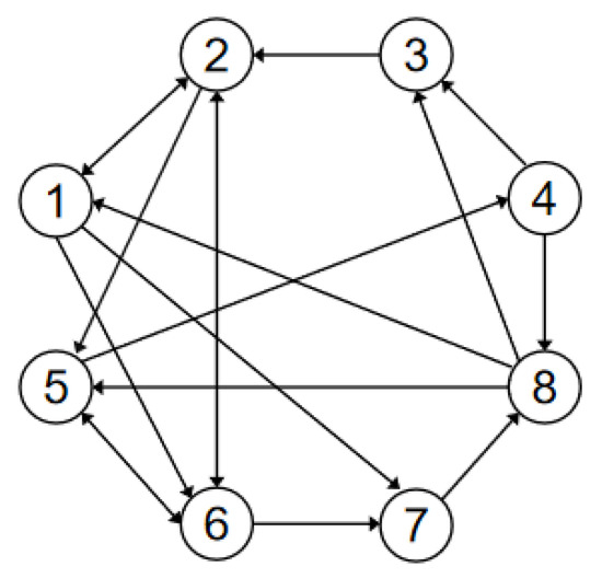 Example 1. Consider a nonlinear system comprising eight agents, where the model of spacecraft formation flying dynamics describes the dynamic of all nodes. The linearized equation for the ith spacecraft is given as follows: