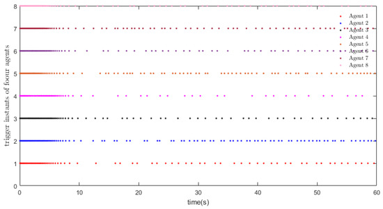 Definition 1. Zeno behavior in MASs is ruled out if a finite number of communication events are satisfied between MASs in any finite time period. Specifically, for every node i, the sequence of triggers, , satisfies the property