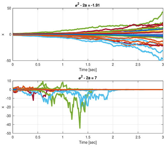 Taking such that , it follows that for , the infinitesimal generator and, therefore, the origin is asymptotically stable in probability. We next see in Figure 1 a case of (Figure 1 top) and a case of (Figure 1 bottom).