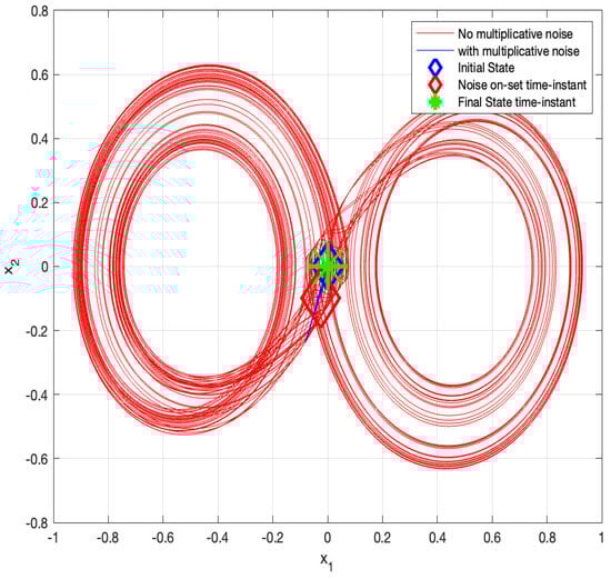 Next, we simulate the above system for 1000 s with an integration step of 0.001 s with for s and for the rest of the time. The results are given in Figure 3 and Figure 4. The phase-plane (i.e., versus ) trajectories are depicted in Figure 3, and the components of the state vector as a function of time are depicted in Figure 4. It can be seen from these figures that the chaotic behavior characterizing the system without the state-multiplicative noise is replaced by a stable trajectory at s, in which SAR is attained. Thus, the feasibility of stabilization by multiplicative noise is demonstrated, using the stochastic control input .