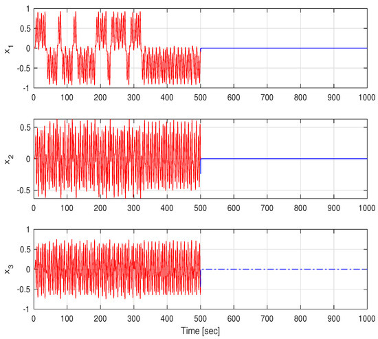 In this section, two numerical examples illustrating the previous theoretical results will be presented. The first corresponds to the case when no nonlinearity is present in System (4). The second is an application to a chaos model of the form System (4) with a nonlinearity.