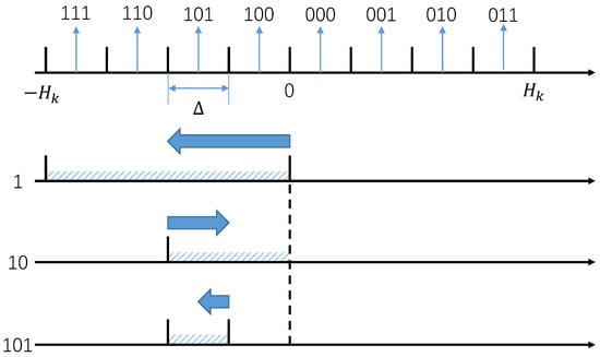 Example of quantization and coding when measurement period . The black dashed line represents the position of the origin corresponding to , the blue shaded areas represent the range of values x based on the current reception, and the blue arrows indicate the change in the estimate of x after each bit is received.