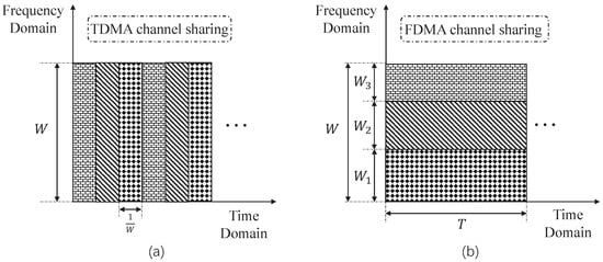 Schematic of sharing the broadcast channel through TDMA or the FDMA mechanism. (a) TDMA channel sharing. The channel cycles through the three users, transmitting one bit per time slot of duration . (b) FDMA channel sharing. The channel is shared by three users in the frequency domain.