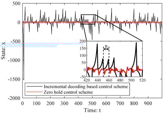 Comparing the results of Equations (10) and (20), we note that the state of the plant under the incremental-coding-based control scheme is smaller than that under the zero-hold control scheme. In particular, based on the analytical result in Equation (20), the value of the state at the -th measurement is obtained as