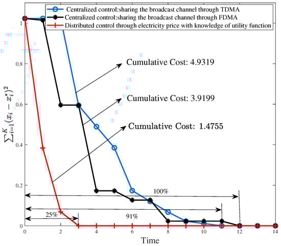 In Figure 8, we compare demand-response performance under different control mechanisms. More specifically, we show the expectation of in the entire process of scheduling signaling transmission. As we can see in Figure 8, compared to centralized control mechanisms, distributed control through electricity price not only exhibits the least cumulative cost 1.4755, but also reduces the cost to 0 fastest, i.e., using 25% of the time of centralized control with FDMA. On other hand, we can also see that the cumulative cost corresponding to centralized control with FDMA is about 3.9199 and smaller than 4.9319 of TDMA. This is consistent with Corollary 4.