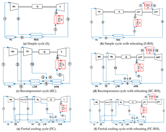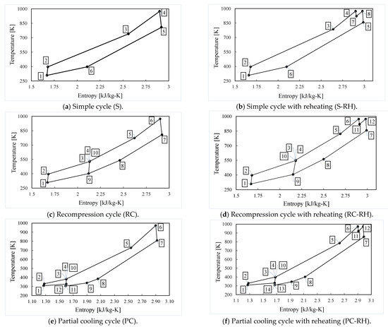 The following six configurations are considered in this comprehensive study, based on the most common cycles found in literature: simple, recompression and partial cooling layouts, all of them with and without reheating [3,4,11,13,14,15,16,17,20,29]. The components diagrams of these cycles are shown in Figure 1, meanwhile, Figure 2 shows examples of their T-s diagrams.