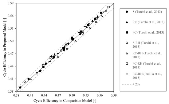 The cycle energy model has been benchmarked by comparing the results obtained with our model against results from the literature [16,24]. Figure 3 shows the comparison of the efficiencies obtained for different cycle layouts and different turbine inlet temperatures. The cycle efficiency has been maximized in our model, as in Turchi et al. [24,32]. All six proposed cycles showed a relative deviation lower than 2% [7,15].