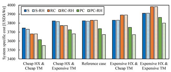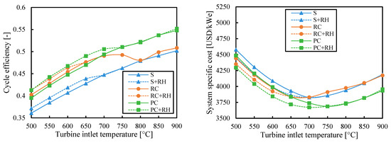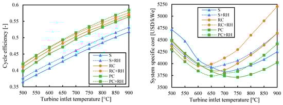 Figure 5 shows the results obtained when the main optimization objective is to minimize the system-specific cost. The system with simple cycle and reheating (S-RH) achieves lower costs than the simple system without reheating (S) when the turbine inlet temperature is less than 700 °C. However, the optimum configuration of the simple cycle with reheating (S-RH) deletes the reheating at higher turbine inlet temperatures, which makes it a simple cycle without reheating (S). The same occurs for the recompression (RC) and partial cooling (PC) cycles. The lines of systems with and without reheating overlap at high temperatures because reheating cannot reduce the system cost.