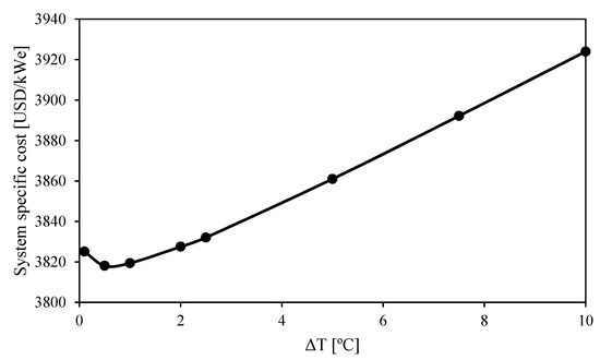 A first analysis for evaluating the relationship between ambient temperature and compressor inlet temperature was performed. In this case, ambient temperature was fixed at 35 °C, while compressor inlet temperature was varied in such a way that the difference between them changed in the range [0.1–10] °C. The system-specific cost of a simple cycle without reheating was minimized by optimizing pressure ratio and regenerator effectiveness. Figure 6 shows that a decrease in this temperature difference led to a decrease in the system-specific cost, except when the temperature difference was really small. Hence, the election of the compressor inlet temperature was made based on the minimum pinch point temperature difference (set to 5 °C, see Table 1).
